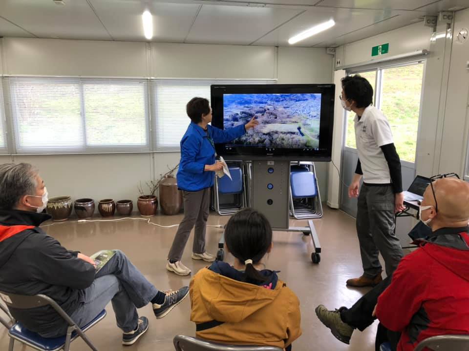 また、ボランティアガイド 浪岡さんから、空からの九戸城跡を見ながらの解説をしていただき、九戸城跡を取り巻く自然地形の雄大さやこの地域の歴史の深さを教えて頂くことができました。